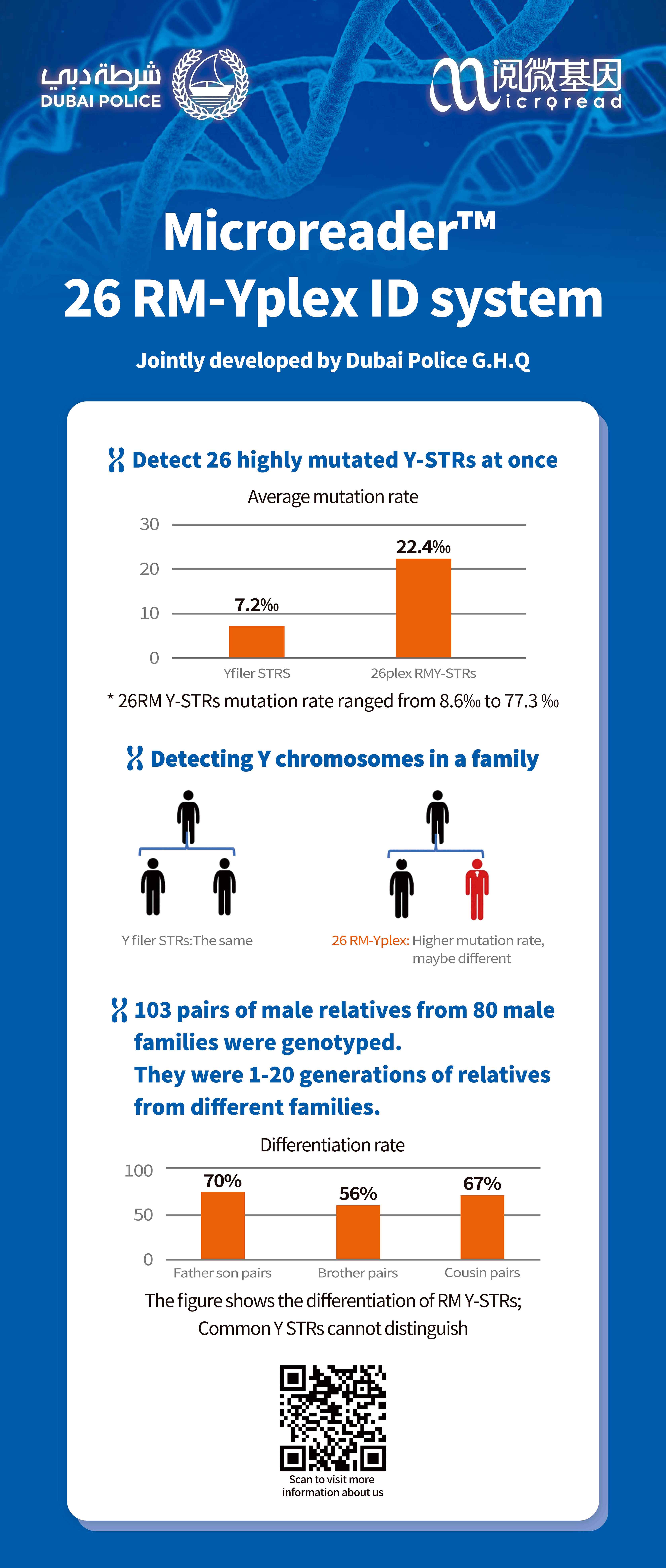 在2022年的世界警察峰会上,阅微基因与迪拜公安总部联合推出的“Microreader™ 26 RM-Yplex ID system”试剂盒,引起了广泛关注。该试剂盒采用26个快速突变Y染色体位点,可有效区分同一家系中的男性个体,尤其适用于性侵案件中的家系排查。目前该试剂盒已经应用于全世界10+个国家的法医实验室。