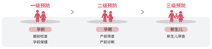 阅微基因生殖遗传产品线全面覆盖出生缺陷三级预防的各个阶段,通过孕前、产前筛查,提前进行遗传咨询和产前诊断,有效避免患儿的出生,新生儿筛查有助于疾病的提前干预和治疗,全面致力于出生缺陷的预防。