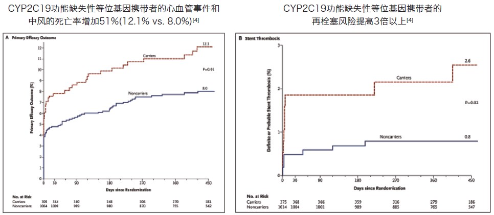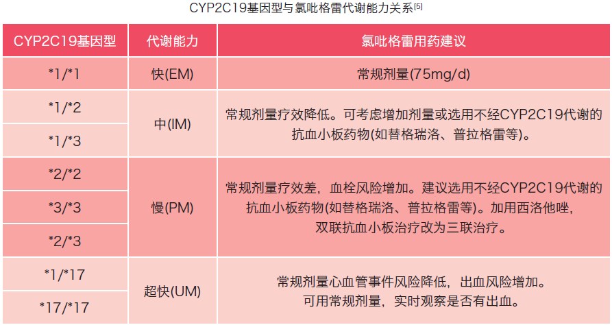 临床研究表明,CYP2C19基因突变导致的弱代谢个体,栓塞重新形成的风险增加,心脑血管事件的发生风险增加,病死率升高。对于这类个体,需要增加氯吡格雷的剂量(负荷剂量为300mg或600mg),以达到阻断血小板聚集的效果。