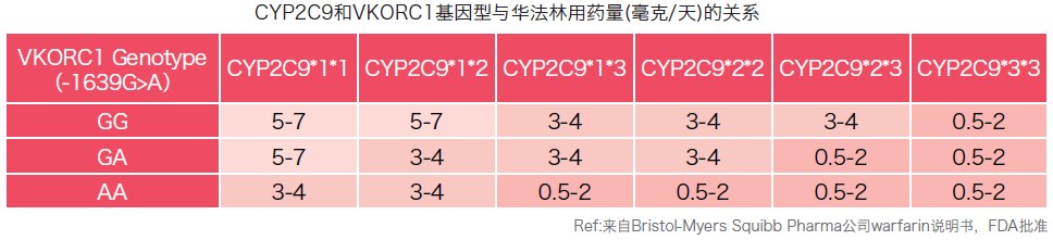 华法林是防治血栓栓塞性疾病的一线药物,但其药物反应个体差异性大,不同个体间华法林稳定剂量的差异可达20倍以上,且治疗窗窄,剂量很难掌握,尤其是在使用华法林抗凝治疗初期,易导致严重的出血并发症。大量研究表明,华法林的药代动力学过程与CYP2C9和VKORC1的基因分型密切相关。2010年FDA在华法林说明书中增加起始剂量选择表,建议在用药前进行CYP2C9和VKORC1基因检测。