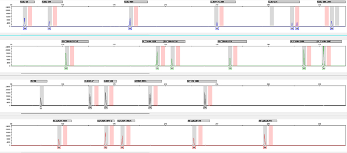 本试剂盒采用荧光PCR 扩增(Quantitive Fluorescent PCR,QF-PCR)结合毛细管电泳检测的方法对GIB2、 SLC26A4、GJB3和线粒体 12S rRNA四个基因的21个突变位点进行检测,并提供专业软件进行结果分析。