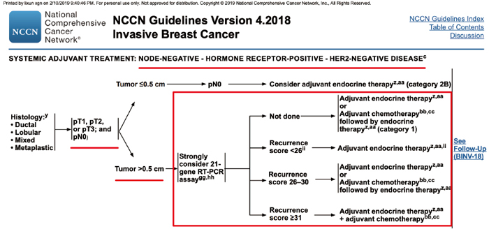 ASCO(2016):对于ER/ PR阳性、her2阴性、淋巴结阴性的早期浸润性乳腺癌,临床医生可以使用21基因评分(RS),以指导系统性辅助化疗的决策[2]。