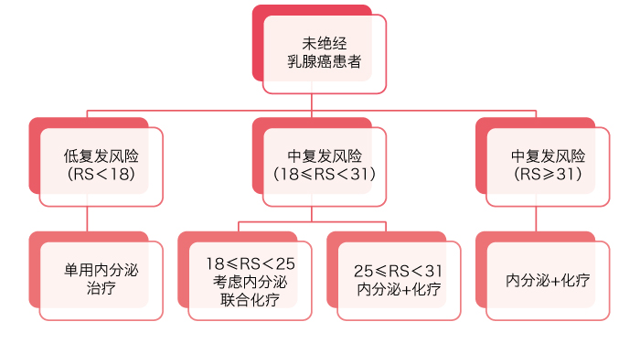 在绝经患者中,RS小于18的患者可以单用内分泌治疗,大于31的患者需要接受化疗联合内分泌治疗;而TAILORx研究结果告诉我们,RS在18~25之间的患者,也可以安全地免除化疗之苦;而对RS在25~31之间的患者是否需要联用化疗,仍旧没有定论。(如下图)