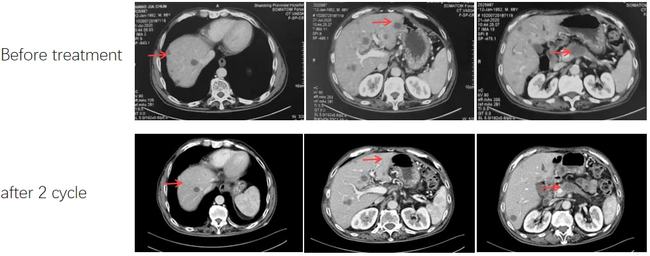 如下图所示,2020年7月至2020年9月,患者接受该联合方案治疗2个周期后,腹痛症状消失,NRS评分降至0-1分,CA199降至861ku/l,CEA降至77.77ng/ml,CT复查显示靶病灶总径较前缩小>30%,疗效评估为PR。