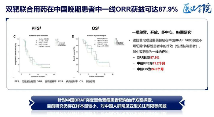 2021年最新发表于Frontiers in Oncology杂志的中国人群数据提示,达拉非尼联合曲美替尼双靶治疗中国1线治疗的ORR达到86.7%,中位PFS为11.2个月,中位OS为24.0个月。与高加索人群保持一致,客观缓解率甚至更优。