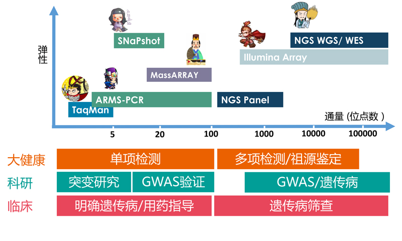 在这两期中,我们把检测SNP的各种方法比喻成有名的三国人物,突出了这些技术的特点,优势和适用性。包括了TaqMan探针法,HRM(高分辨率溶解曲线)法,SNaPshot法,ARMS-PCR法MassARRAY质谱法,芯片法和二代测序测序法,面对不同的实际应用需求,这些方法各擅胜场,就如同必须要有那么多人才才撑得起三国的精彩一般。