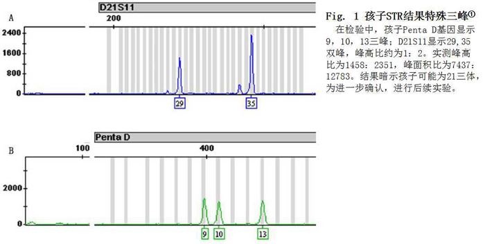 一位母亲带孩子来做亲子鉴定。工作人员按照常规流程采集血样,并使用MicroreaderTM 21 ID System进行STR分型。然而,孩子的STR分型结果却出人意料:Penta D基因型为9,10,13(母亲为9,13);D21S11基因型为29,35(母亲为32.2,35),峰高比1:2,见Fig. 1. 除去Penta D,孩子的其余20个STR均遗传母亲的一个等位基因;而除去Penta D及S21S11,两者的联合亲子指数为4,10,144。