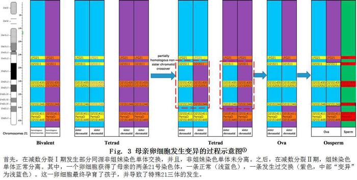 研究人员注意到,“表现”不同的STR位点之间,存在某种空间位置关系,如表 1所展示。阴影部分的四个STR基因座,对应于上述只有两个峰的位点,位于21号染色体的“中部”;其余三峰位点,位于21号染色体的“两端”。由此,一个可能的猜想就是:母亲在减数分裂Ⅰ期发生了21号染色体上的部分同源非姐妹染色单体交换(约19181770 ~ 39499178区域),而后,在Ⅰ期又发生了不分离,因此,两条母亲21号染色体都遗传给了孩子(一条正常,一条发生部分交换)。在Fig. 3中,研究人员展示了这一变异过程。随后绘制的21号染色体杂合基因座比例图也证实了这一猜想。