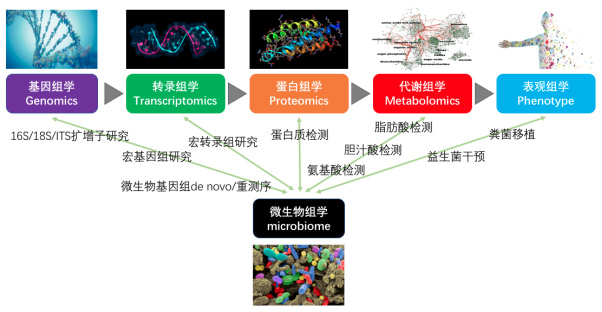 正式开始之前,我们先来看一个重要概念——“系统生物学(Systematic biology)”。系统生物学是一个较新的学科,涵盖了基因组学、转录组学、蛋白组学、代谢组学和表观组学等,其目的就是要将多组学联合起来,从整体层面上探讨生物学问题。随着微生物组学研究的不断升温,系统生物学的思想也被运用进来,研究者们不局限于基因组和转录组学的探索,更加入了代谢组或蛋白组学的研究,从整体的系统层面上阐述微生物与人体相关的科学问题,探索微生物对人体疾病的关系,寻求疾病诊断新型标准物,改善人体健康等。