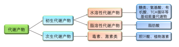 代谢组学(Metabolomics)是指对某一生物、组织或细胞中相对分子量低于1000的低分子量代谢产物进行定性和定量分析,并寻找代谢物与生理、病理变化的相关关系的一门科学。随着高通量检测技术的快速发展,代谢组学已经渗透到多个领域,如疾病诊断、药物研发、植物学、毒理学、微生物学及人类健康等。代谢产物可大致分为初生代谢产物和次生代谢产物,初生代谢产物又可以进一步分成水溶性代谢物和脂溶性代谢物,而次生代谢产物则是经由次生代谢途径产生的一些结构较为复杂的分子如毒素和激素类。