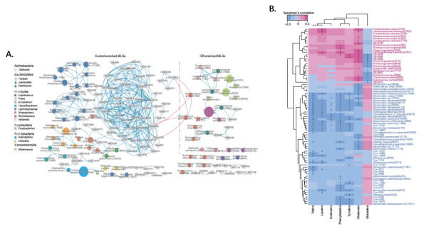 B.基于MLGs的菌种类型与7种氨基酸产生聚类热图。