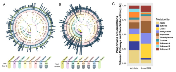 Barton, W等人研究了职业运动员和具有久坐生活模式的人群的肠道微生物的差异。先前的研究利用16S rDNA扩增子测序的方式研究了运动员和久坐人群肠道微生物的组成,结果显示运动员的肠道微生物多样性明显高于久坐人群,且特定菌种Akkermansia muciniphila 含量在运动员粪样中要明显比久坐人群高。在新的研究成果中,研究人员继续了先前的研究,对40个橄榄球运动员和46个久坐人群的粪便样本进行宏基因组测序,经过基因功能与代谢通路分析表明,专业运动员与久坐人群的肠道微生物在代谢水平上差异更为显著,尤其在氨基酸合成、碳水化合物降解和次级产物代谢、短链脂肪酸(SCFAs)合成等,在代谢通路上专业运动员比久坐人群具有更高的活性。最后,通过对尿液和粪便样本中的代谢物进行检测,发现在运动员样品组中短链脂肪酸、丙酸盐、丁酸盐等含量更高,这与运动员的饮食中比例较高的纤维膳食摄入及肠道内SCFAs合成途径有关,而短链脂肪酸确实对一系列健康参数有影响,包括免疫力、结肠上皮细胞完整性和脑功能等。通过后续的关联分析得出,短链脂肪酸的产生和Akkermansia有轻微的负相关性,且和Roseburia 及Family XIII Incertae Sedis 有较为明确的正相关性。