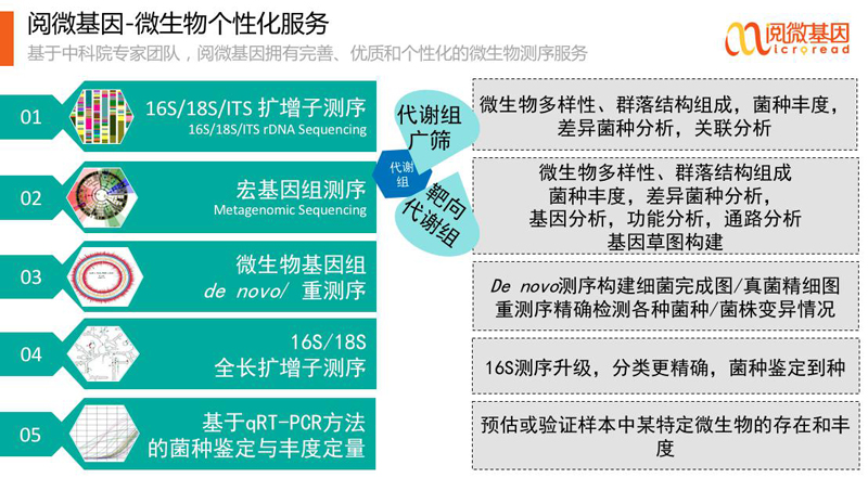 除了肠道粪便与内容物样本之外,我们也对各式各样的样本进行过微生物的提取,包括空气、污泥、海水、作物果实表面、口腔拭子、土壤等,均顺利获得较好的测序结果。阅微基因可基于多种平台提供完善的微生物组学研究服务,并联合安隆科讯提供代谢组学联合研究的解决方案。具体服务项目和应用优势如下图所示: