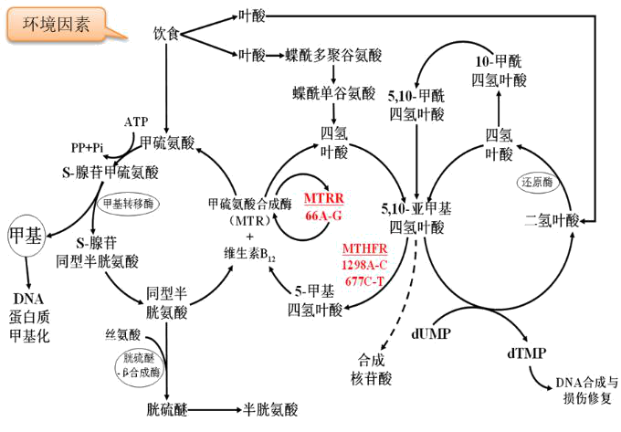 亚甲基四氢叶酸还原酶主要作用是在叶酸代谢通路中将5,10-亚甲基四氢叶酸转化为具有生物学功能的5-甲基四氢叶酸,后者可以进一步进入甲基传递通路,通过同型半胱氨酸的重新甲基化过程间接为DNA甲基化和蛋白质甲基化提供甲基,并且使血液中的同型半胱氨酸(Hcy)水平保持在一个较低的水平。