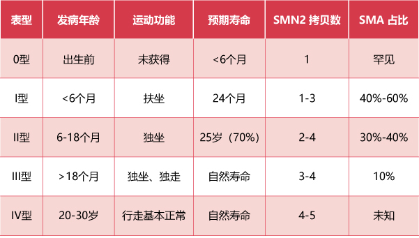 根据起病年龄、病情进展速度、肌无力程度及存活时间长短,SMA可分为以下几型: