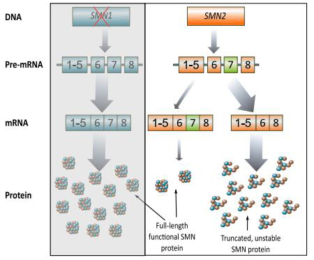 目前导致SMA的“元凶”已经被找到,是异常的运动神经元生存基因1(SMN1)在作祟,SMN1基因的缺失或突变会导致SMA,而SMN1基因在基因组上还有一个高度同源的SMN2基因, SMN2基因的缺失不会导致SMA,但是SMN2基因的拷贝数却会影响SMA严重程度。