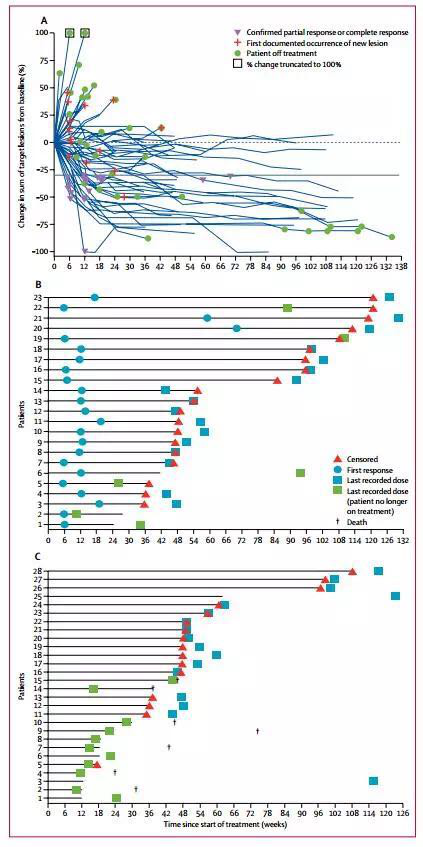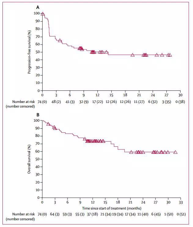 截止2017年1月时,仍有36名(49%)患者仍在接受治疗。23名患者获得了客观缓解,51名患者在接受纳武单抗治疗12周时疾病得到了控制。