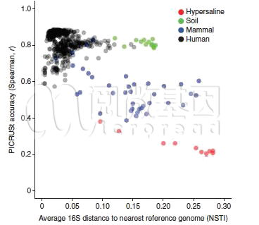 除此之外,PICRUSt 对于不同样本类型的微生物,其预测效果是不一样的。对人类或者哺乳动物的微生物预测效果最好, 对参考微生物基因组不全的样本类型,例如土壤和盐碱地,预测效果就会下降。