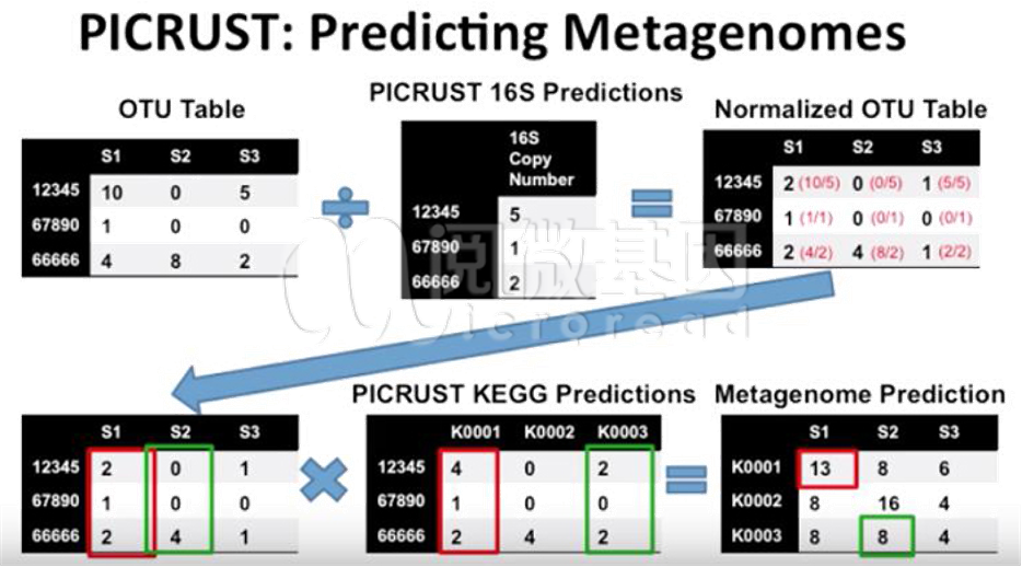 3. 根据对应的近缘物种功能基因数 counts,结合预测标准化 OTUs counts 进行计算,最终得到样本和其功能基因的表格;