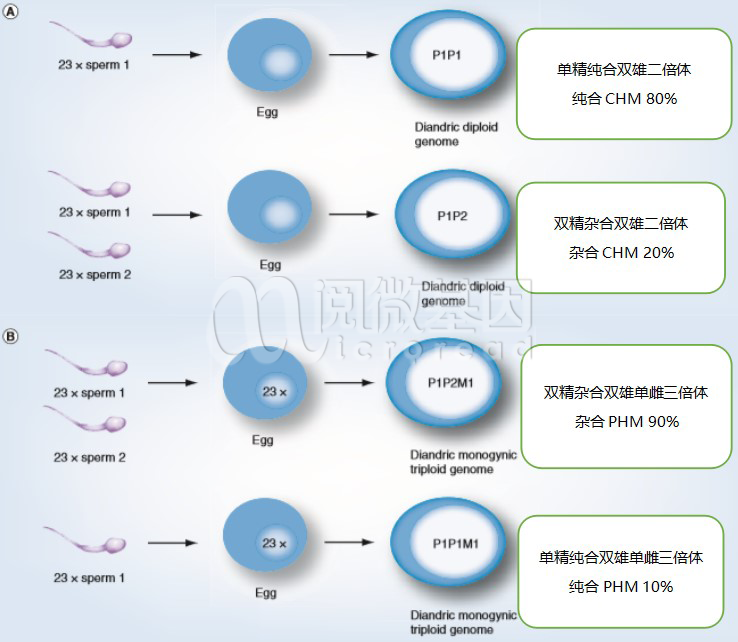 ● PHM为正常卵细胞的双精受精,具有三倍体染色体(69XXY、69XXX和69XYY),包括双精杂合双雄单雌三倍体型和单精纯合双雄单雌三倍体型,但并不是所有的三倍体妊娠都是PHM,还有1/3的三倍体妊娠是由于减数分裂过程中母体染色体未分离而形成的双雌单雄性基因组,此为非葡萄胎型三倍体。(见下图)