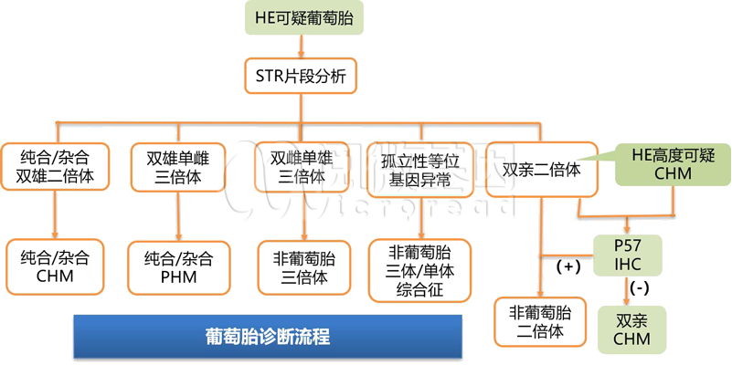 2014年第4版《女性生殖器官WHO肿瘤学分类》强烈推荐葡萄胎的辅助诊断应选用基于DNA基因分型(STR基因分型)技术。通过对绒毛和蜕膜进行STR基因分型检测,可明确异常胚胎染色体来源,确诊葡萄胎以及葡萄胎的具体分型,从而指导治疗及预后。