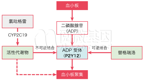 氯吡格雷属于噻吩并吡啶类ADP 受体拮抗剂,为前体药物,需经肝酶代谢转化为活性药物不可逆地与血小板ADP 受体结合,从而发挥抑制血小板聚集作用;