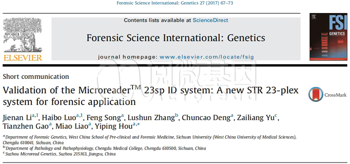 我们或多或少可能都会接触一些试剂盒验证的项目及任务。可不要小瞧验证实验,如果严格地对一款试剂盒做好各项验证实验,其数据是可以发表在法医学顶级期刊的!比如阅微基因的Microreader™ 23sp ID System 试剂盒,验证实验由华西医学院侯一平老师独立进行,验证结果发表于法医学顶级期刊FSI:Genetics (图1)。验证工作的重要性可窥一斑。