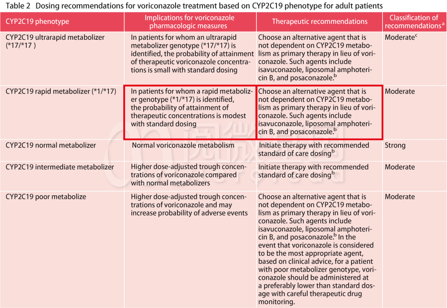 1. 在超快速代谢和快速代谢基因型的患者中,标准剂量下伏立康唑浓度达到治疗性伏立康唑浓度的可能性很小。选择一种不依赖CYP2C19代谢的替代药物代替伏立康唑作为主要治疗药物。这些药物包括异戊康唑、脂质体两性霉素B和泊沙康唑。