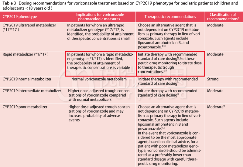 2. 对于儿童快速代谢者,推荐以标准剂量开始,监测血药浓度并调整到最佳治疗剂量。  (及时获得具有超速和快速代谢表型的儿科人群中的伏立康唑治疗浓度是困难的。由于在达到治疗浓度时可能会失去关键时间,因此建议使用替代抗真菌药,以便孩子尽快接受有效的抗真菌治疗。)