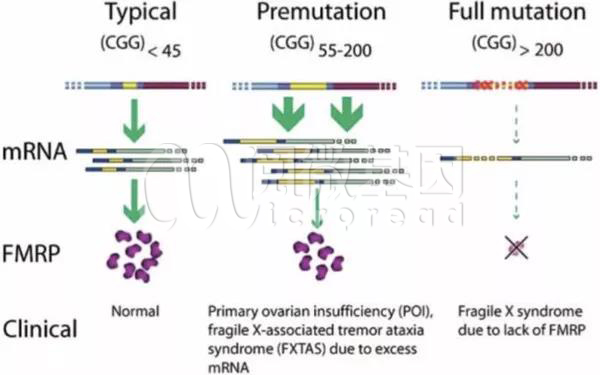 与FXS不同,前突变携带者的致病机制是FMR1 mRNA水平升高导致RNA毒性。