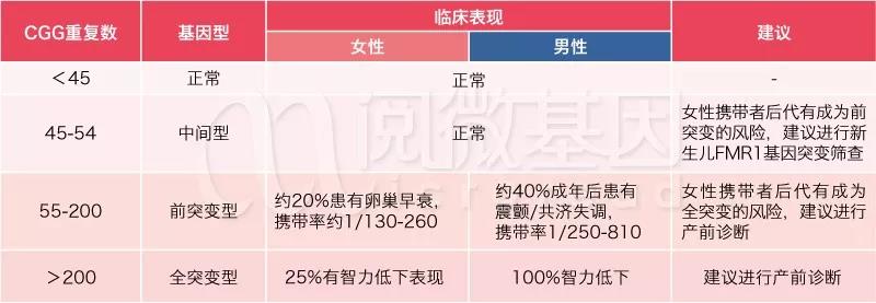 根据FRM1基因的(CGG)n重复次数不同,将突变类型分为中间突变、前突变和全突变三种类型。三者(CGG)n重复数和相关临床表型如下: