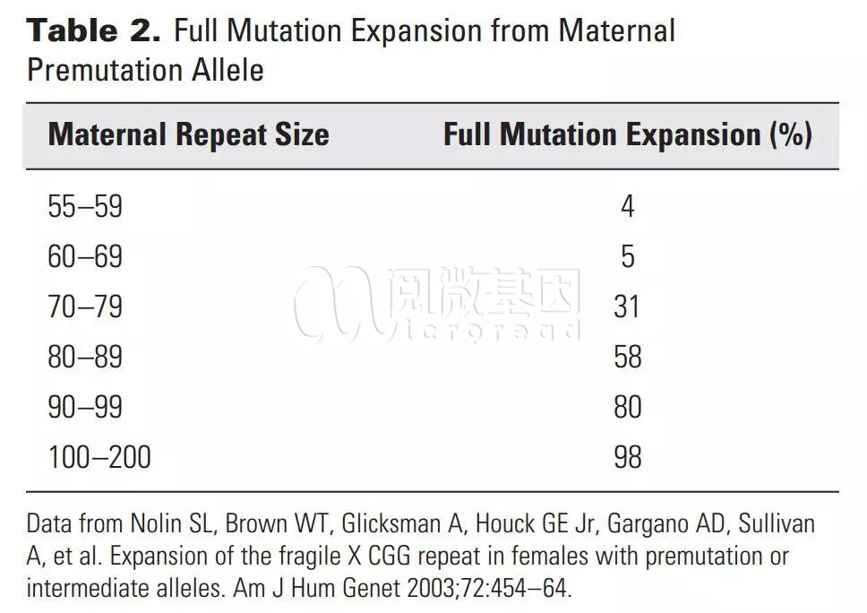 · 母系特点:患有FXS的男性通常不会生育,据报道只有1%的FXS男性患者有后代。同时,由于为X染色体连锁,前突变的男性只会将前突变传递给他们的女儿,重复的次数相对稳定。因此由前突变扩展为全突变只发生在母亲向后代的传递中。
