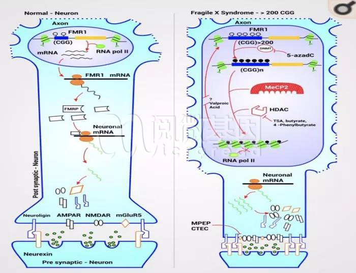 FXS是由于脆性X智力低下蛋白(FMRP)缺失引起的,FMRP是一种细胞内RNA结合蛋白。这种缺失使树突信号通路失调,并影响大脑海马突触可塑性。导致FMRP缺失的主要致突变机制是FMR1的5 ' UTR区CGG重复异常扩增,导致该区域异常甲基化,随后发生转录沉默。