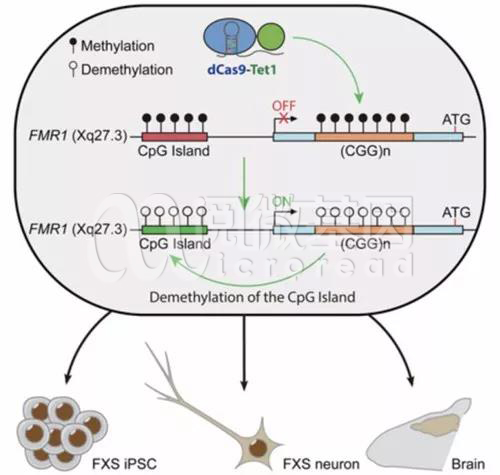 将上游FMR1启动子的异染色质状态转换为活性染色质状态,从而恢复FXS iPSC 中FMR1的持续表达[6]
