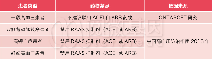 ONTARGET 研究纳入了 23,400 例高危心血管疾病患者,随访 56 个月的结果发现,替米沙坦和雷米普利两者联用较单用两种药物并未降低主要终点事件发生率,反而较单用雷米普利增加了低血压、晕厥和肾功损伤等不良反应发生率[6],所以对于ACEI 和 ARB药物一般不建议联合使用。