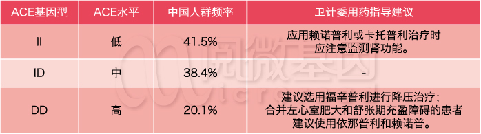 血管紧张素转换酶(ACE) 是ACEI药物的作用靶点。ACE基因位于17号染色体上,其第16内含子带有一段287bp的插入(I)或缺失(D),I/D多态性影响了血液ACE水平和ACEI类药物疗效:DD基因型个体其血浆ACE的活性升高,对福辛普利的降压疗效增强;而II基因型患者应用赖诺普利或卡托普利时肾功能下降更明显,应注意监测。此外, I/D多态性还是决定人体有氧耐力素质的关键因素,II基因型的人有氧运动耐力较好,对耐力训练的敏感性较高;而DD基因型则可能是冠心病、心肌病、高血压等多种心血管疾病发病的独立危险因素。