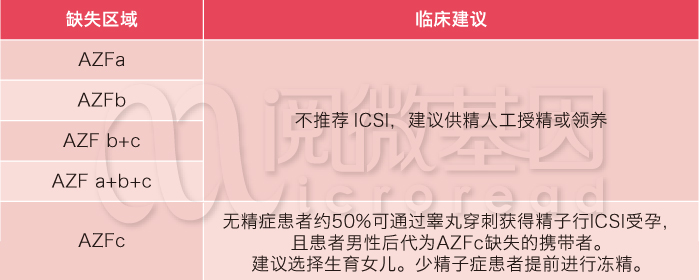 AZFa、b或c区域缺失临床表现差异较大,检测结果可指导后续治疗、生育指导及遗传咨询,为医生对是否进行二代试管婴儿辅助生育的选择提供有力的诊断依据。