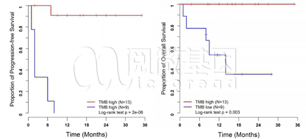 来自Marwan Fakih博士领导研究团队,报道了在MSI-H型结直肠癌患者中,TMB-H患者较TMB-L患者更能够从PD-1/PD-L1抗体治疗中获益[5],相关研究于4月30日发表于Annals of Oncology。研究纳入了22名经免疫检查点抑制剂治疗的MSI-H患者,其中19人使用的是帕博利珠单抗(Keytruda)。经panel测序获得其TMB值,本研究中TMB的阈值经计算为37~41 突变/Mb。全部13名TMB-H患者达到CR/PR,而6/9名TMB-L患者病情进展。TMB-H患者中未达到中位PFS(中位随访时间18个月),而TMB-L患者中位PFS仅为2个月( HR = 0.03, [95%CI, 0.003~0.23], P = 0.00087 )。进一步分析表明,将OS作为评价标准,TMB同样是免疫检查点抑制剂治疗的疗效预测标志物。