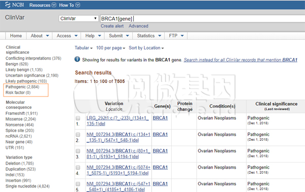 ClinVar 数据库中关于BRCA1基因定义了2,884个明确的致病突变