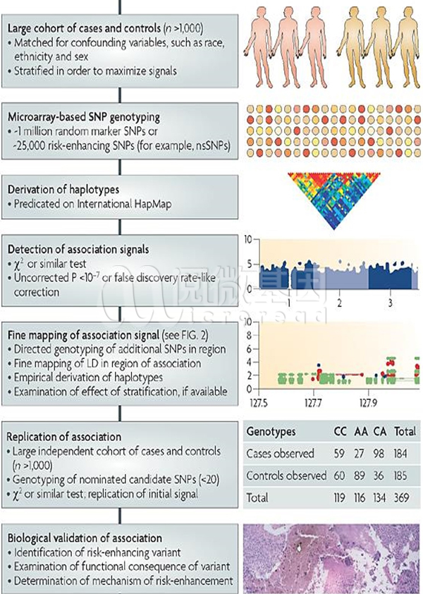 是指在全基因组层面上,开展多中心、大样本、反复验证的基因与疾病的关联研究,是通过对大规模的群体DNA样本进行全基因组高密度遗传标记(如SNP或CNV等)分型,从而寻找与复杂疾病相关的遗传因素的研究方法。