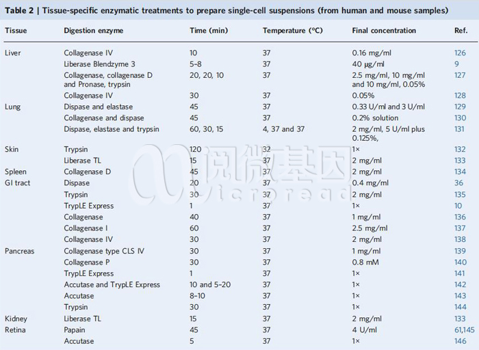 1.实体组织需要在一开始进行机械分离或酶消化处理。首先,组织需要通过物理切割或刀片切碎,然后通过酶消化来分离细胞。特定的组织消化酶及消化时间需要仔细选择。2.样本准备过程可能会引起细胞中基因表达模式的改变,特别是一些胁迫相关基因的激活。此外,一些敏感的细胞亚型可能在此过程中受到伤害。所以,样本准备过程越短越好。相反,如果消化时间太短,可能导致细胞分离不完全,需要在后续单细胞分析过程中排除掉这些紧密相连的细胞。3.在细胞解离的过程中加入DNase I可以防止细胞团块的形成。