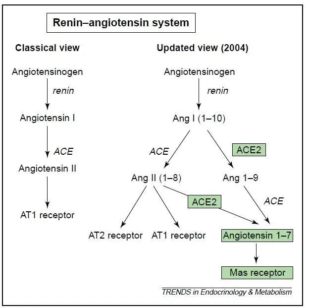 上文介绍了ACE2在冠状病毒感染过程中发挥的关键作用——作为冠状病毒的功能受体,介导病毒入侵和细胞融合。如果说此功能是2003年后,随着对SARS-CoV的研究而发现,那么自2000年ACE2被发现伊始,它的另一个功能——参与肾素-血管紧张素系统(renin-angiotensin system, RAS)对人体血压的调控(间接帮助降血压),则更为人所知。