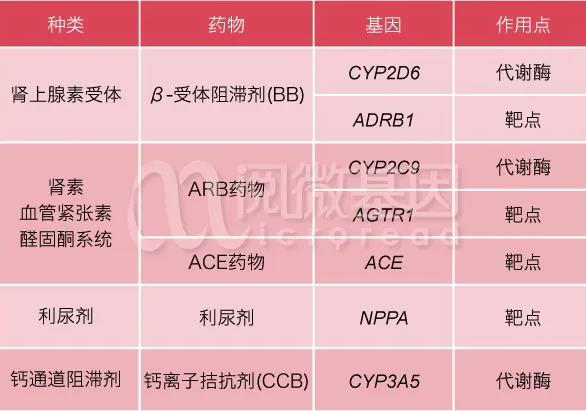 研究表明, ACE(该基因编码ACE蛋白,是ACEI药物的作用靶点)和AGTR1(angiotensin II type 1 receptor,该基因编码AT1蛋白,是ARB药物的作用靶点)均存在多态性,会影响患者服用ACEI和ARB类药物的疗效。阅微基因致力于基因检测技术和产品研发,其心血管精准用药项目可以检测与常见5种高血压药物相关的基因多态性,详见下表。