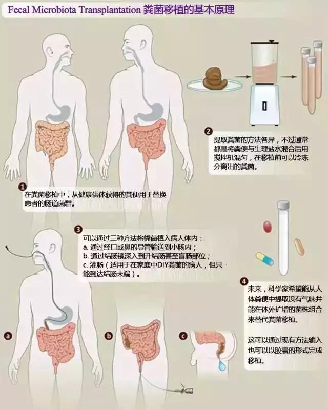 粪菌移植是另辟蹊径的一种简单粗暴的改善肠道菌群的方法。它的好处在于一次移植,粪菌菌群可以在体内保持24周,而口服益生菌可能只能保持2周时间。这种方式在治疗复发性难辨梭状芽孢杆菌感染、炎症性肠病、肠易激综合征、便秘、代谢综合征、慢性病毒性肝炎与肝性脑病等各种疾病上都有应用。