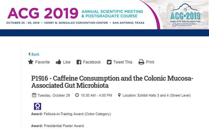 [3] Shawn G. et al. (2019). P1916 - Caffeine Consumption and the Colonic Mucosa-Associated Gut Microbiota. ACG 2019.
