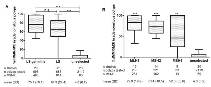 Parag D. Dabir 等人[5]在European Journal of Human Genetics 上发表的一的一项荟萃分析,最终共纳入41项研究,分别包含519例LS患者和1698例未选择患者两个队列,分别分析883和2119个常规腺瘤,评估在LS和未被选择的患者腺瘤中dMMR/MSI的发生率和危险因素,以探讨dMMR/MSI在腺瘤中作为LS的生物标志物的潜力。