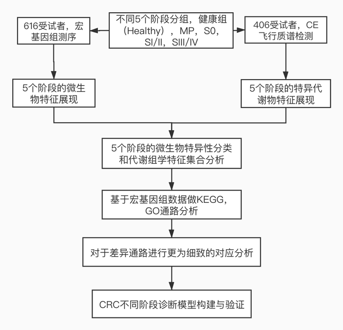 结直肠癌可分为遗传性结直肠癌和散发性结直肠癌,在散发性结直肠癌的发生过程中,会先形成息肉样腺瘤,然后发展成为粘膜内癌,最终成为恶性肿瘤。本研究对千余名健康人和不同阶段的结直肠癌患者进行研究,利用宏基因组和代谢组检测的方法,以探究粪便微生物和代谢产物在不同结直肠癌发展阶段性特异表型,筛找出疾病标志物,为CRC发展阶段的诊断治疗奠定理论基础。