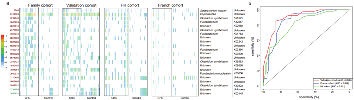 通过对宏基因组的数据分析,挑选了22个和CRC显著相关的微生物功能基因,其中一半基因来源于厚壁菌门。这些功能基因涉及到群体感应、短链脂肪酸代谢、基因信息处理、DNA服务与修复等。利用此22个基因构建随机森林模型,分别对验证组(46CRC,40健康人)、香港地区数据(74CRC,54健康人)和法国地区数据(53CRC,88健康人)进行验证。其中验证组、香港组、法国组的AUC值分别为0.905、0.811、0.886。