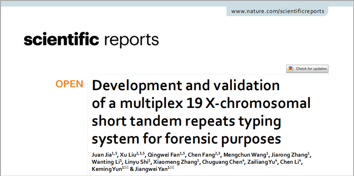 近日,阅微基因与山西医科大学法医学院严江伟教授团队验证了一种新型高效的多重荧光标记19X-STR分型体系,即采用5色荧光标记技术对19个X-STR基因座和一个性别位点Amelogenin进行复合扩增,旨在为法医实验室提供更加灵敏的多重X-STR试剂盒。根据SWGDAM验证准则对19X-STR多重分型体系进行了多项性能和法医参数的测试,测试结果表明该分型系统对于分析法医案件和数据库样本均稳定可靠,并且符合司法部发布的法医物证鉴定X-STR检验规范。相关文章近日发表于Scientific Reports。