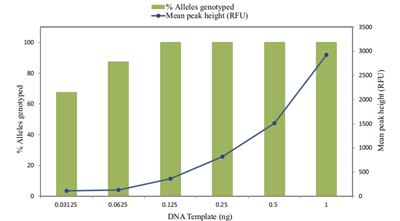 ■ 灵敏度高:DNA模板含量低于0.125ng时,仍可得到完整分型,以及有效的基因座信息。